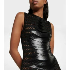 Showcase Alaïa’s iconic sculptural design with the 3D knit dress. Made in Italy, this futuristic piece has a dimensional lace mesh construction that shrouds the silhouette with a lacquered finish.