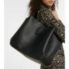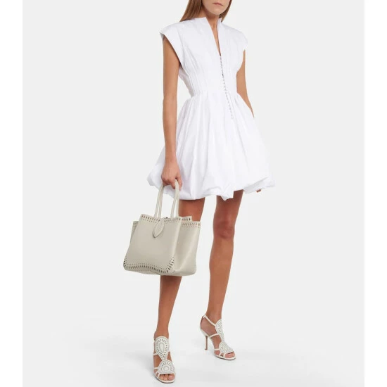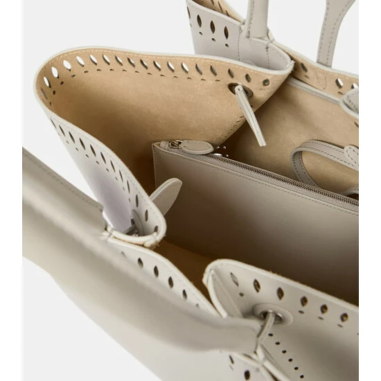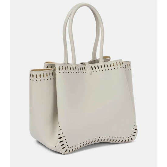 Petal-inspired laser-cutting and expertly designed soft folds make the small Angele 25 tote an Alaïa heirloom. Made from gently pebbled gray leather, the design secures with an ogive-shaped strap across the open top.