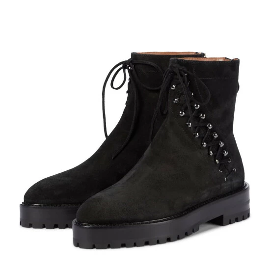 Alaïa proves its dedication to unique and carefully crafted designs with the Asym ankle boots. Made in Italy from black suede in a round toe silhouette, the pair comes with lace-up detailing that winds around the sides artfully and can be zipped up in the back.