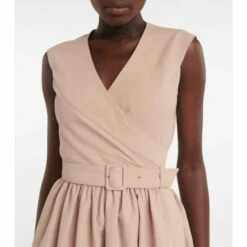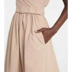 Put a vintage spin on your summer edit with this beige day dress from Alaïa. Made from mid-weight cotton, it has a wrap-style bodice that evokes ’50s collared silhouettes and is enhanced with a tea-length circle skirt. The tone-on-tone belt creates a defined waist, but our favorite feature is the discrete cutout at the back – a small concession to modernity.