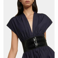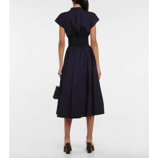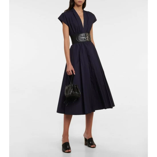 This day dress from Alaïa is made from crisp cotton poplin and has an elegantly gathered waist that’s cinched with a leather-paneled belt. Side slip pockets add an unexpected practical finish.