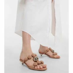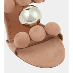 The Bombe sandals from Alaïa are made in Italy from soft beige suede, set on barely-there heels, and finished with the style’s signature round embellishments.