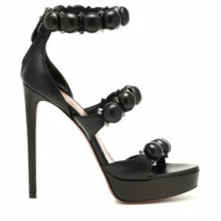 A trio of straps embellished with pyramidal studs elevates the Bombe sandals from Alaïa. This all-black pair has been crafted in Italy from smooth lamb leather, and it’s set on a plateau sole and sky-high stiletto heel. Let yours uplift a classic LBD for a tough-luxe take on envied evening looks.