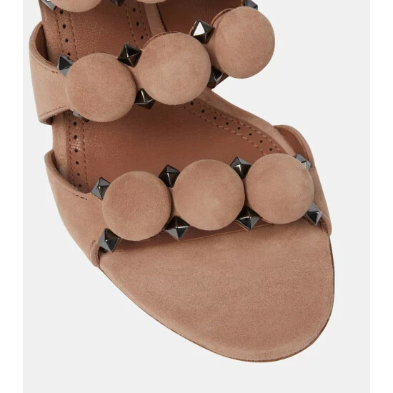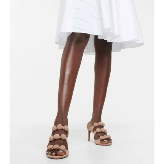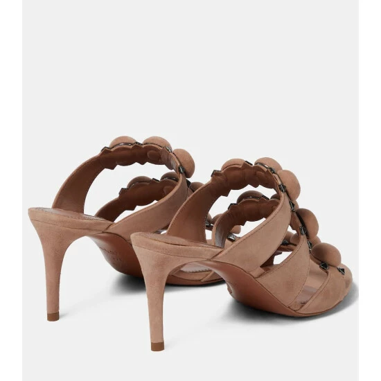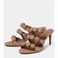 Alaïa’s Bombe sandals can be worn with both daytime and evening ensembles. Set atop 85mm stiletto heels, they’re made from soft tan suede, and feature three straps embellished with pompoms and platinum-toned studs.