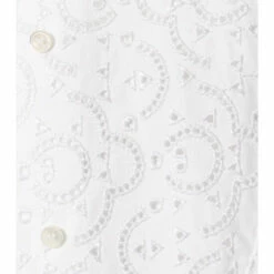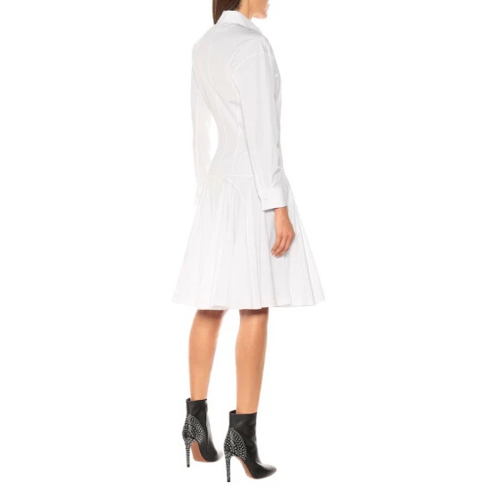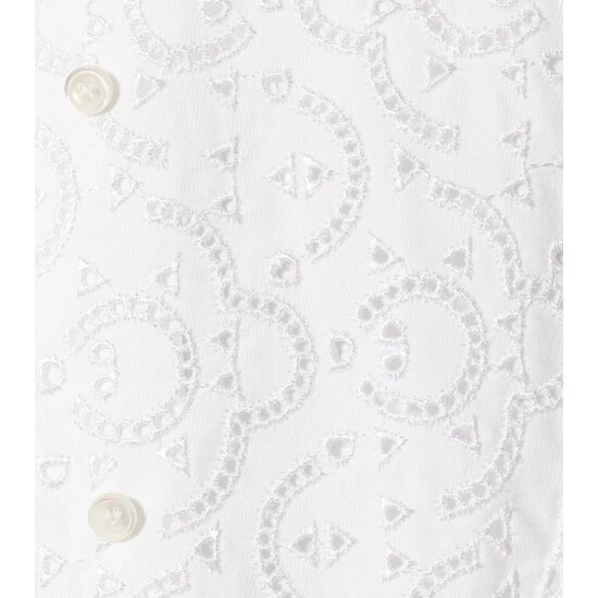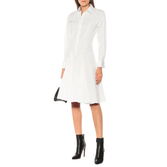 Alaïa reimagines the classic white shirt dress with this relaxed silhouette. Cut from crisp cotton to a midi length, it features a drop waist and shoulders. A perforated, lace-trimmed bib front and pleating accent the design. Partner yours with platform sandals for a directional daytime look.