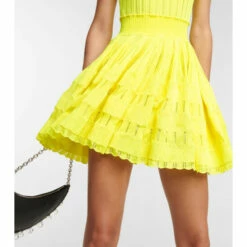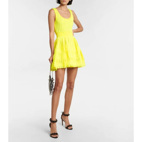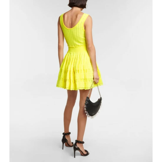 The Crinoline minidress showcases Alaïa’s artful affinity for sculptural design. Framing the silhouette with a scooped neckline and a voluminous skirt, this piece has a ribbed-knit construction with contrasting pointelle panels and a scalloped trim.