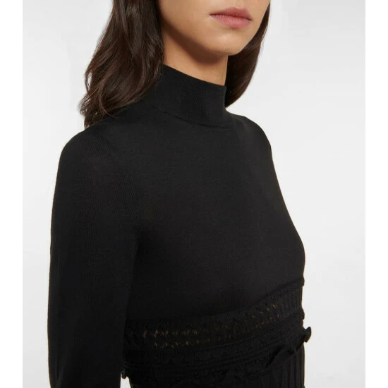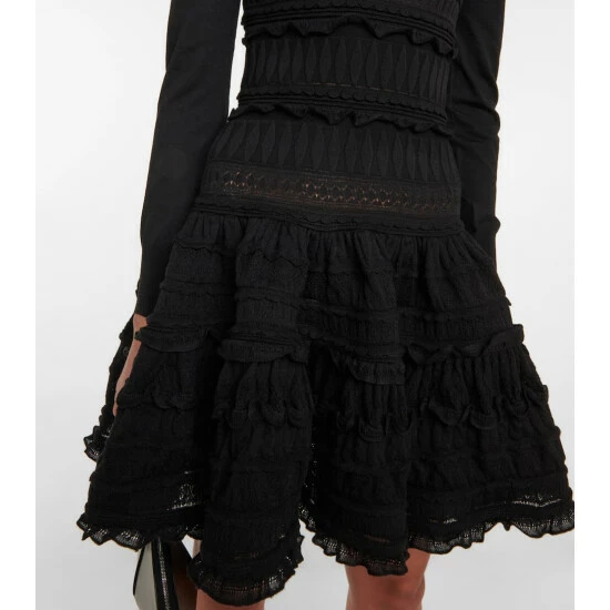 The Crinoline minidress showcases Alaïa’s artful affinity for sculptural design. Framing the silhouette with a scooped neckline and a voluminous skirt, this piece is made from pure wool in a ribbed-knit construction with contrasting pointelle panels and a scalloped trim.