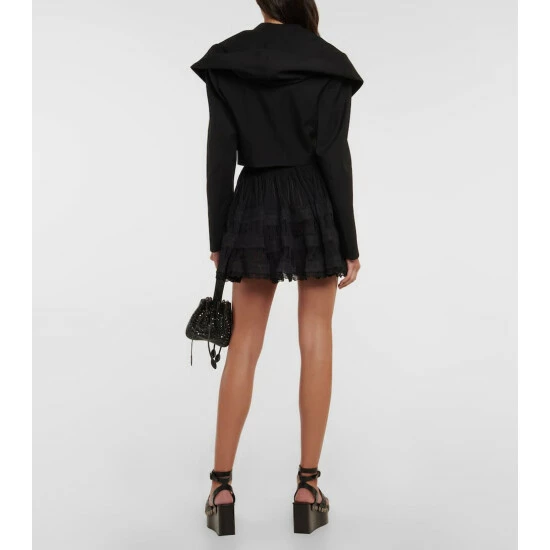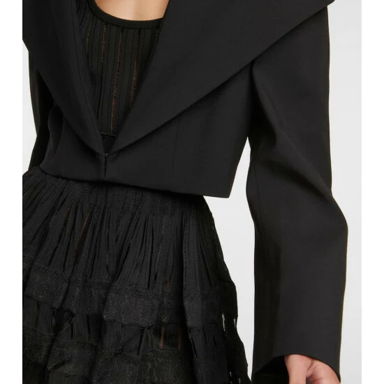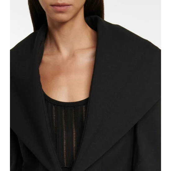 This elegant blazer from Alaïa will pull together your evening looks. Made from wool twill in a boxy silhouette, it has a layered neckline, hook-and-eye closure, and smooth satin lining.