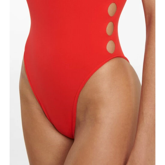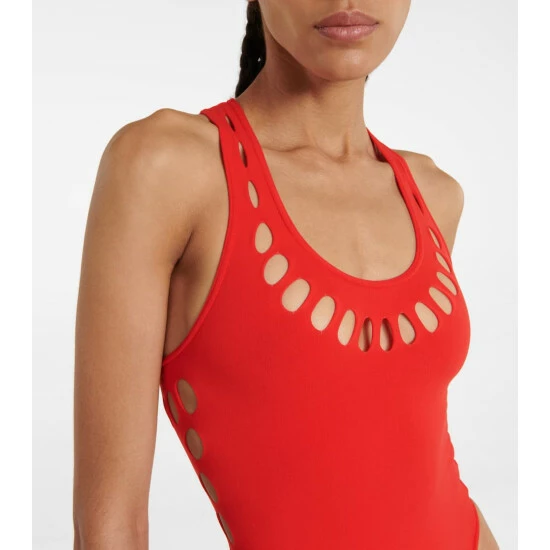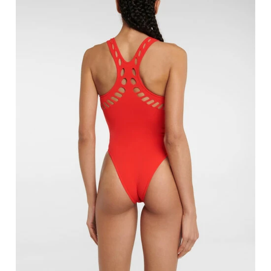 Bring Alaïa’s impeccable designs to the poolside with this elegant red swimsuit. The racerback style is made from stretch-fused swim fabric and detailed with the house’s signature cutouts at the neckline and back.