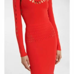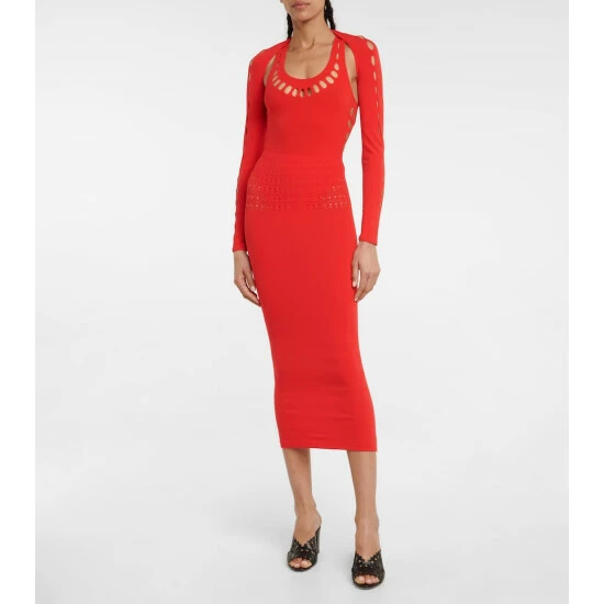 This figure-hugging midi skirt from Alaïa is made from technical swim fabric. The red design is accented with Vienne cutouts that enhance the waist and it can also be worn as a strapless dress or draped skirt.