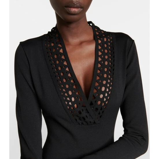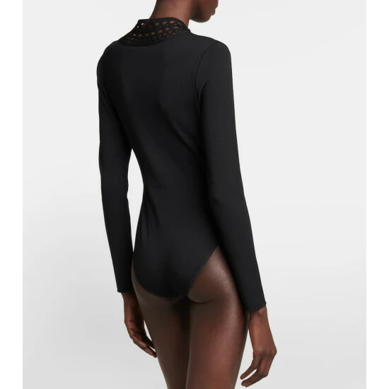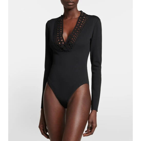 Alaïa’s iconic Vienne motif is an openwork laser-cut pattern that’s inspired by lace and architecture. This bodysuit makes for an alluring base layer with its plunging V-neck and sculpting shape.