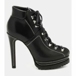Punctuated with silver-tone studs, these black platform ankle boots from Alaïa will put a rebellious stride in your step. Made in Italy from leather, they’re cut to a round-toe silhouette with towering stiletto heels and chunky rubber-tread soles. Showcase yours with cropped pants and midi skirts alike.