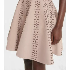 This miniskirt from Alaïa is patterned with geometric shapes that mimic the maison’s trademark laser-cut design. It’s knitted in beige jacquard with a typically flared hemline for a feminine feel. Style with the label’s tonal ballet flats.