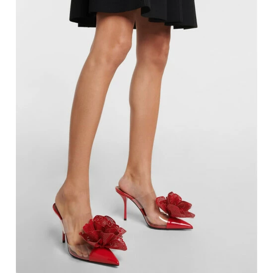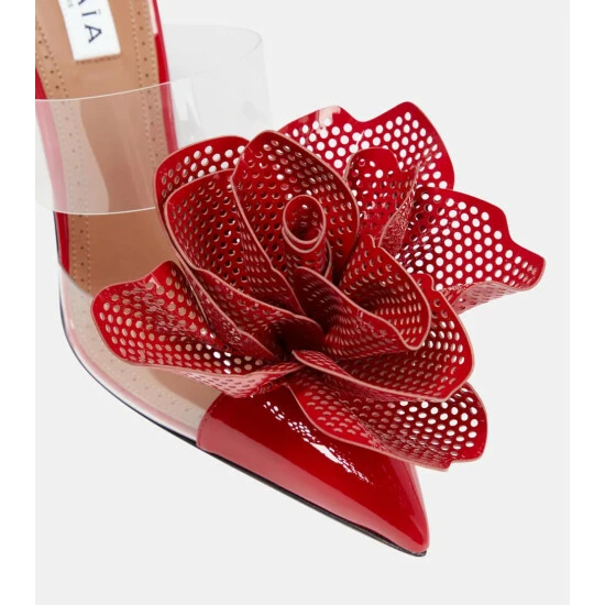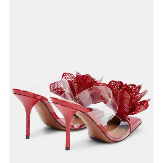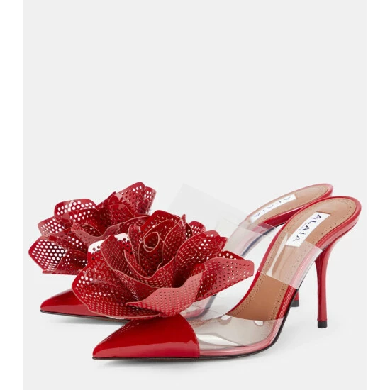The Fleur mules from Alaïa are punctuated with perforated rose-sculpted appliqués at their razor-sharp profiles that showcase the brand’s coveted laser-cut Vienne motifs. They’re made from glossy patent leather with clear PU straps and low stiletto heels.