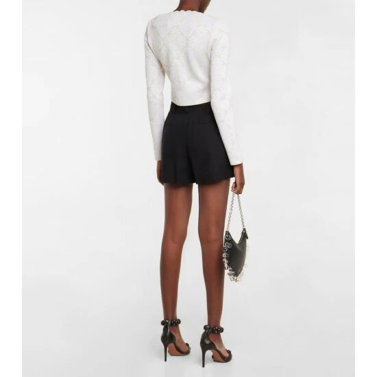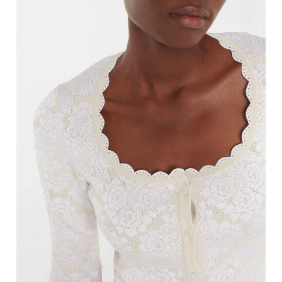 Made from a knit fabric with floral patterning, this cardigan from Alaïa has a scalloped u-neck and a cropped length.