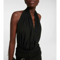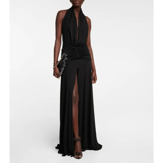 Eveningwear is now elevated with this chic halterneck gown from Alaïa. This piece will catch eyes with its deep V-neck, beautifully draped skirt, and ruched detailing that defines the waistline.