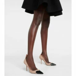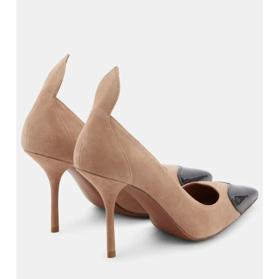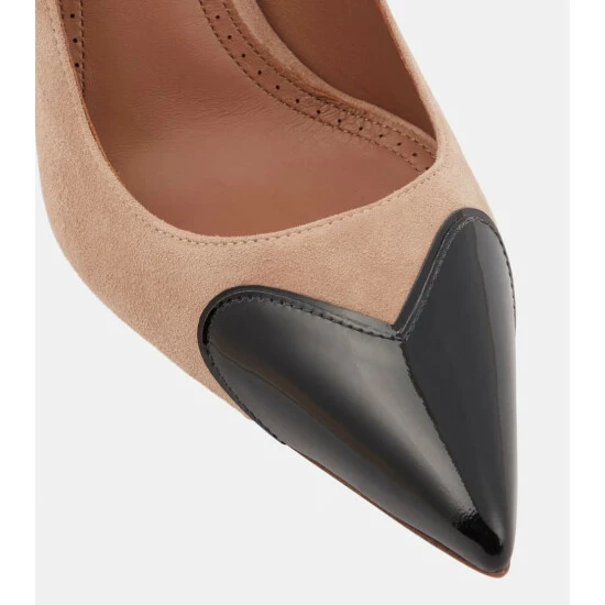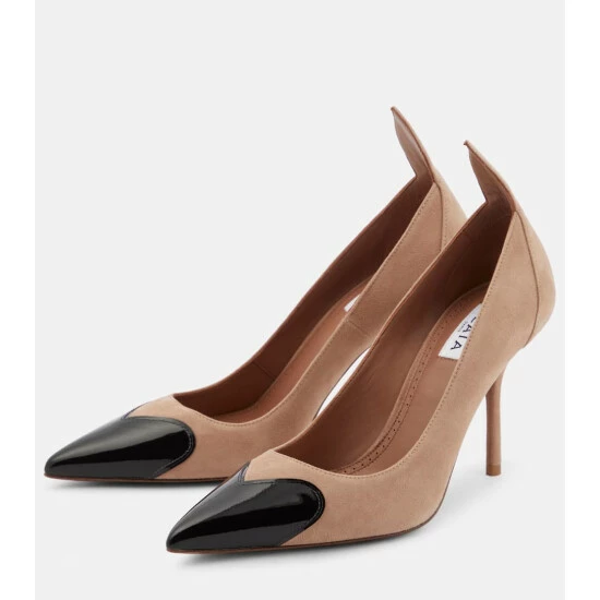 Alaïa will captivate you with its Heart pumps. The ultimate feminine footwear design, this suede style is detailed with patent leather hearts on the pointed toes and features elongated heel tabs.