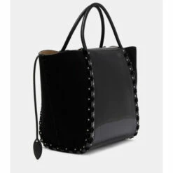 Alaïa’s patent leather Hinge Medium tote is aptly named for the illusion made by silver-toned stud embellishments, and leather handles looping through from one side to the other. This design features a magnetic closure and side ties.