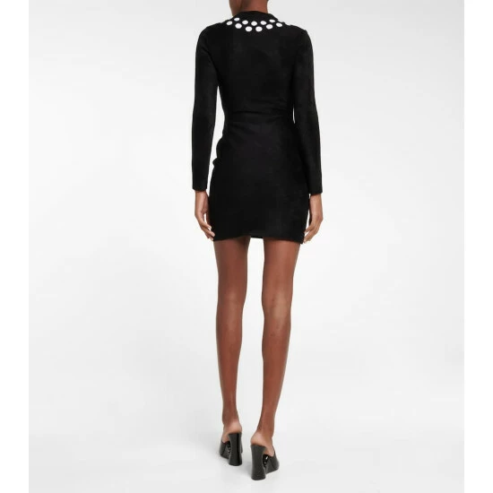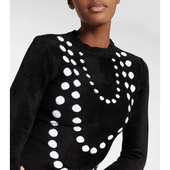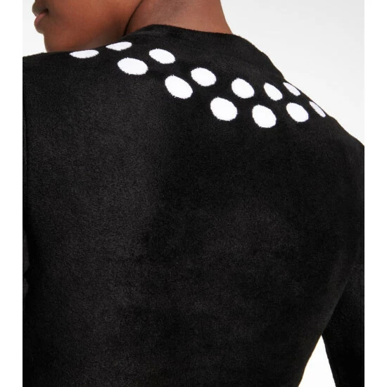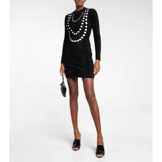 This minidress from Alaïa is made in Italy from a wool blend. It has a fitted silhouette with a high neckline, finely ribbed trims, and a dotted jacquard motif at the chest..