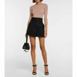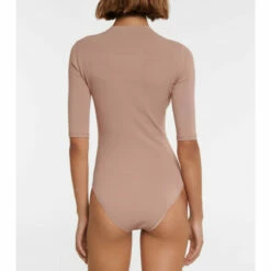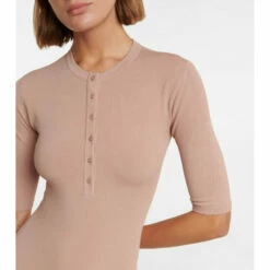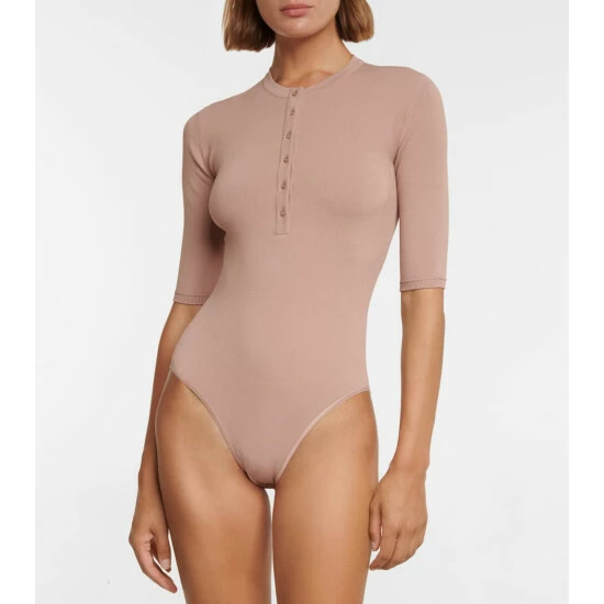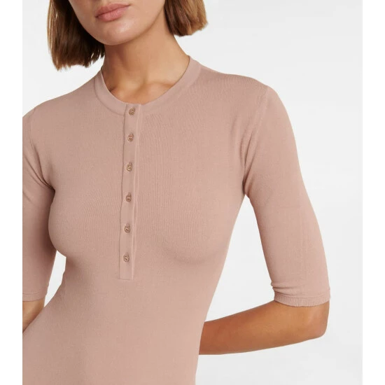 This bodysuit from Alaïa is made from the brand’s characteristic knit fabrication. It has a fitted silhouette, a partial button placket, and elbow-length sleeves.