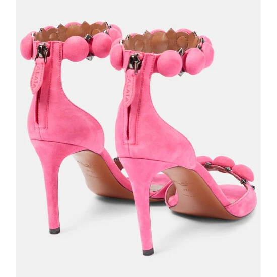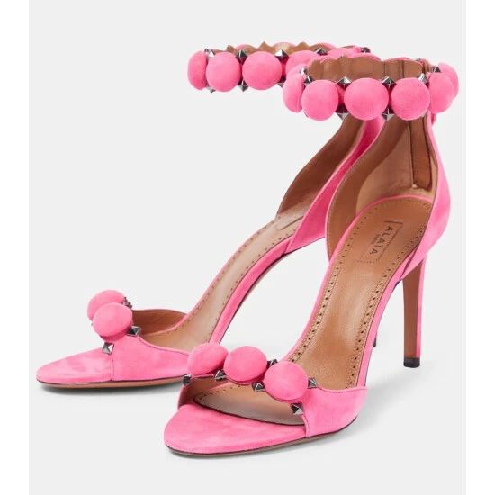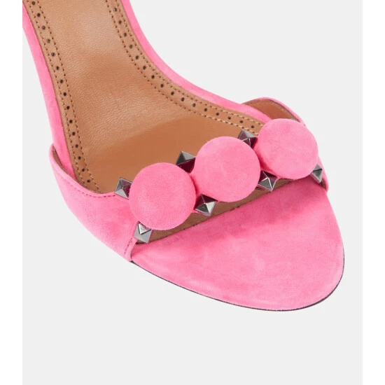Alaïa’s signature La Bombe sandals balance an elegant form and tough-luxe metal finishes. They are crafted in Italy from suede with hemispherical and pyramid-shaped studs, and have 90mm stiletto heels.