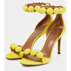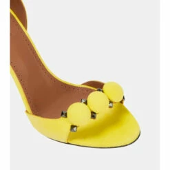 Alaïa’s signature La Bombe sandals balance an elegant form and tough-luxe metal finishes. They are crafted in Italy from suede with hemispherical and pyramid-shaped studs, and have 90mm stiletto heels.