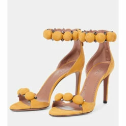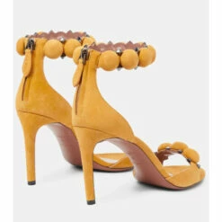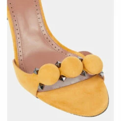 Alaïa’s signature La Bombe sandals balance an elegant form and tough-luxe metal finishes. They are crafted in Italy from suede with hemispherical and pyramid-shaped studs, and have 90mm stiletto heels.