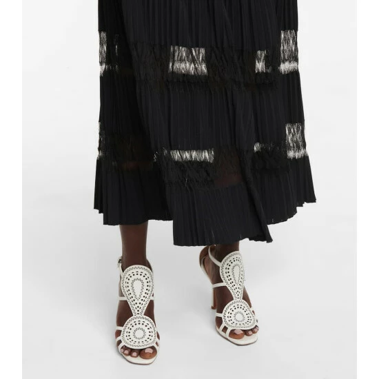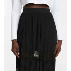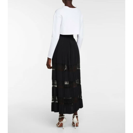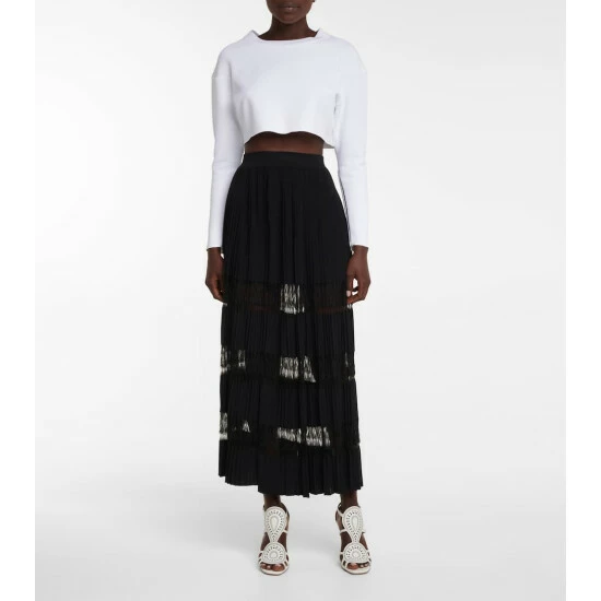 Sheer lace inserts lend a touch of signature Alaïa allure to this maxi skirt. It’s made from black knit fabric with a touch of silk blended in, and is structured with rippling accordion pleats.