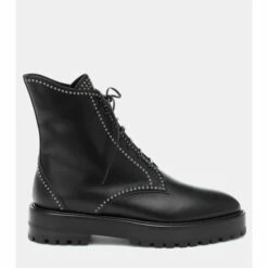 These lace-up ankle boots from Alaïa are refined in design yet tough enough to ground even your most feminine mini and midi dresses. Made from polished black leather with slightly pointed toes, stud-embellished uppers rest on chunky outsized soles. Complement the silver-toned hardware with chain-link jewelry in the same hue.