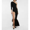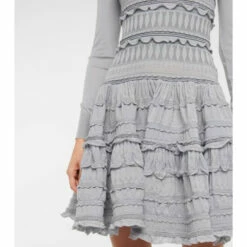 Master Alaïa’s sculptural design language with this body-hugging dress that falls into a voluminous skirt from the hips down. This long-sleeved design is made from a wool-blend knit with intricate openwork lace panels and ruffles in sophisticated gray.