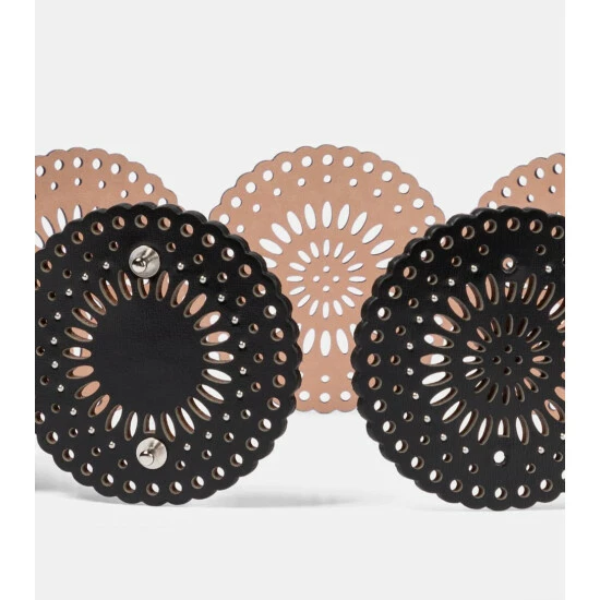 With every Alaïa collection, there’s a series of amazing belts to style with it, such as this beautifully crafted piece in black leather. Designed with signature laser-cut perforations, it features a medallion shape that echoes motifs from this season’s ready-to-wear offering.