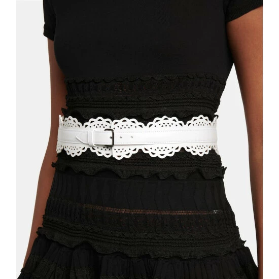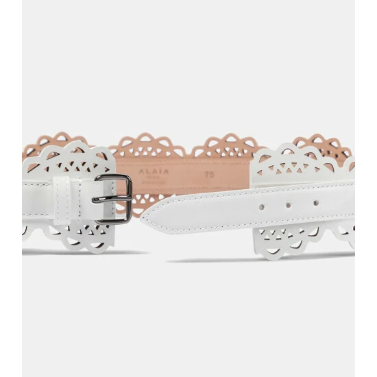 Alaïa designs have always emphasised the female silhouette, and this white belt is no exception. Made in Italy from calfskin, it has laser-cut details synonymous with the label and secures with an antiqued metal buckle.