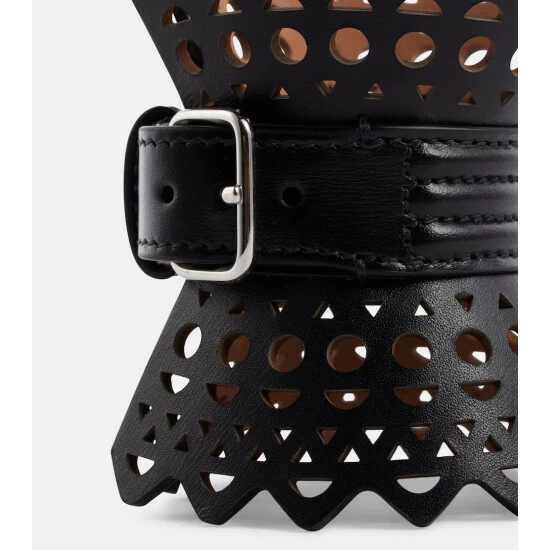 Made in Italy from soft lamb leather, this Alaïa bracelet features a thick strap with buckle fastening and the signature Vienne motif laser-cut on the slightly flared sides.