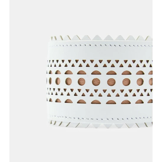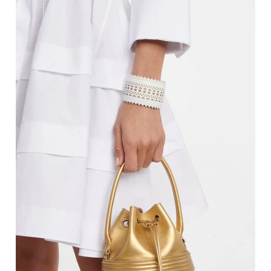 This wide, laser-cut bracelet from Alaïa lends a statement finish to your looks. It’s made from white lamb leather with the label’s signature “Vienne” openwork motif.