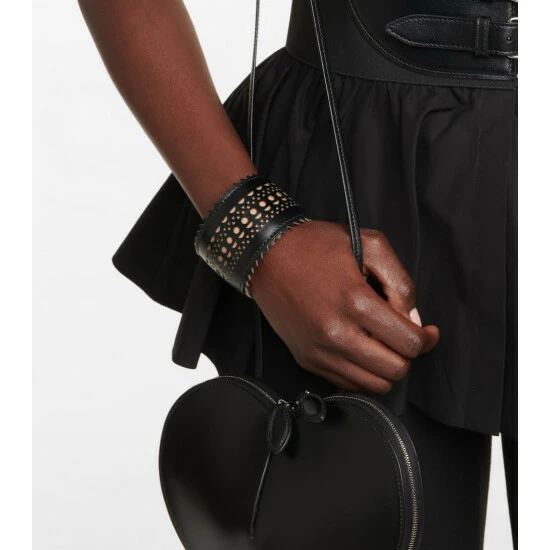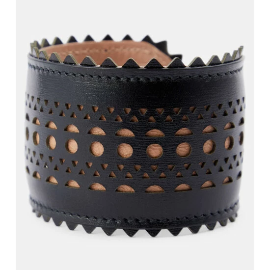 This wide laser-cut bracelet from Alaïa lends a statement finish to your looks. It’s made from black lamb leather with the label’s signature “Vienne” openwork motif.