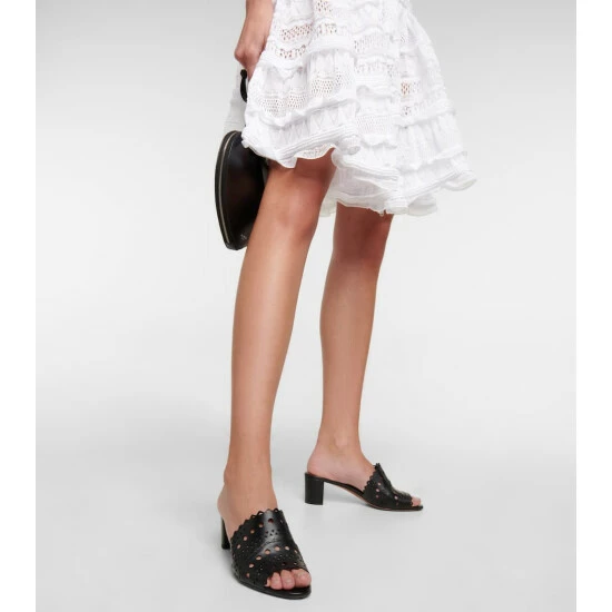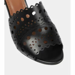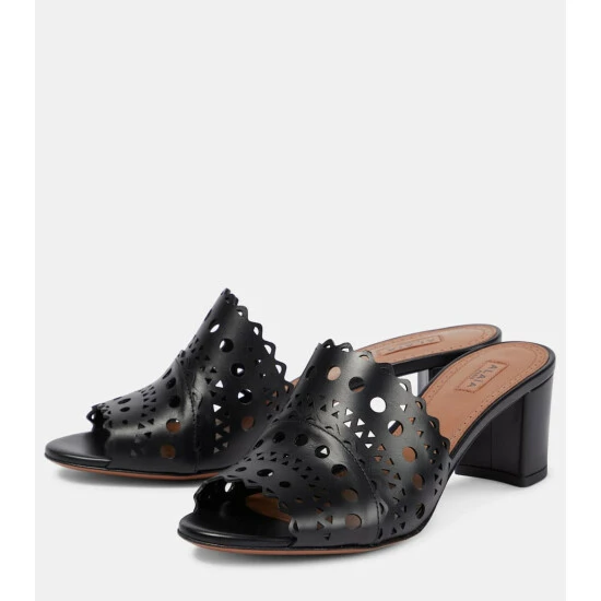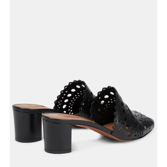 These mules are laser-cut to an openwork “Vienne motif”, one of Alaïa’s signature design techniques. They’re crafted from leather and set atop medium block heels.