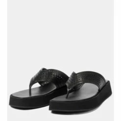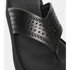 Alaïa’s signature laser-cut perforations add elegance to an enduring favorite footwear silhouette: thong sandals. The flatform pair is made from smooth black calfskin leather and shaped with contemporary square open toes. Swing the label’s coordinating Mina tote alongside for directional appeal.
