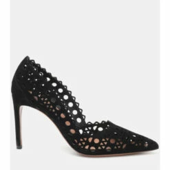 Alaïa utilizes modern fabrication techniques to create pieces such as these black pumps. Made in Italy from suede that’s laser cut with geometric shapes, they’re cut to a point-toe silhouette with 90mm stiletto heels. They’ll prove an intriguing accent to understated looks.