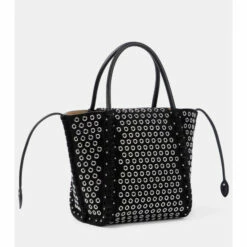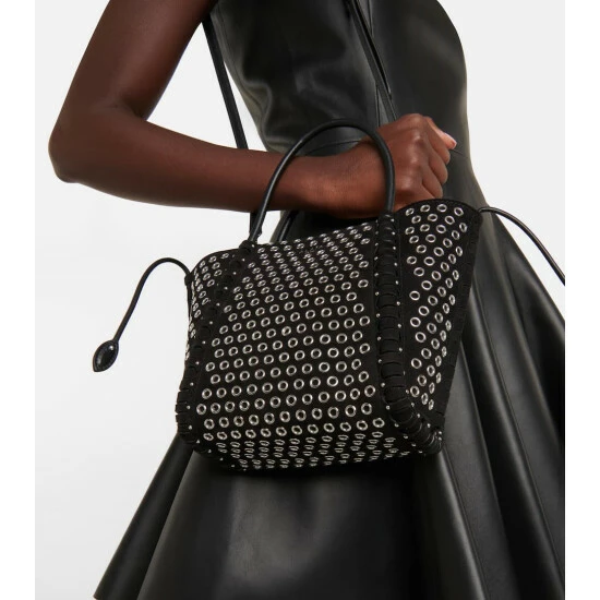 Made from leather that’s perforated with rounded studs, Alaïa’s Le Hinge tote is a compact design with double top handles, a suede lining and a top magnetic closure.