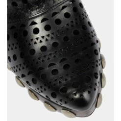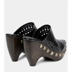 Alaïa elevates the clog mules with laser-cut leather uppers in the brand’s signature Vienne openwork design. They’re set atop studded wooden platform soles with curved heels.