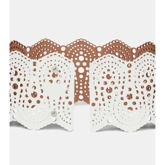 Make this white corset belt from Alaïa the focal accent of refined looks. It’s made in Italy from lazer-cut calf leather and fastens via silver-tone press studs.
