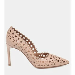 Alaïa utilizes modern fabrication techniques to create these blush pink pumps. Made in Italy from leather that’s laser cut with geometric shapes, they have a point-toe silhouette with 90mm stiletto heels. They’ll prove an intriguing accent to understated looks.