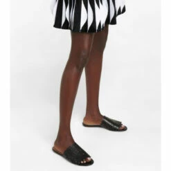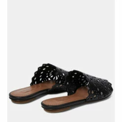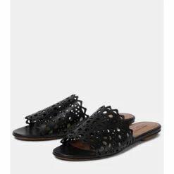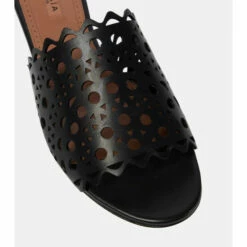 These Alaïa sandals are marked by iconic laser-cut ‘Vienne’ motifs and scalloped edges that will underpin every ensemble. This black leather pair features a simple wide strap, flat sole and subtle lift at the heel.