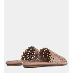 Iconic laser-cut “Vienne” motifs and scalloped edges easily mark these slides as the work of Alaïa. Made from polished powder pink leather, they wide straps, round toes and slender soles. Slip yours on with floating midi dresses for an effortless transition from day to night.