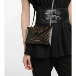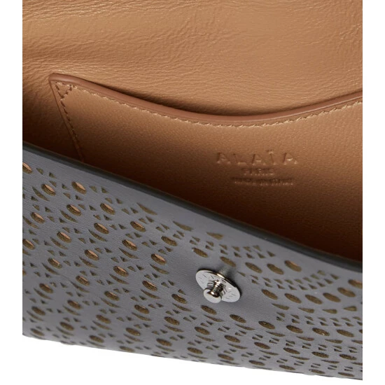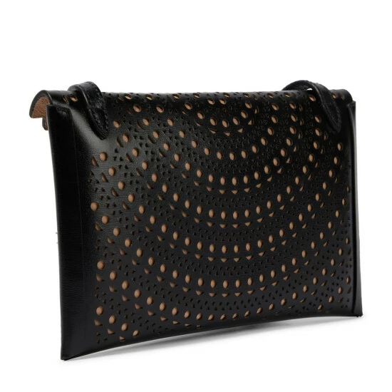 Alaïa’s Louise design honors a beloved French socialite and her accessory of choice: the envelope clutch. Made from black leather, it’s laser-cut to label-signature “Micro Vienne” motifs, with a detachable shoulder strap and contrast lining.