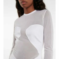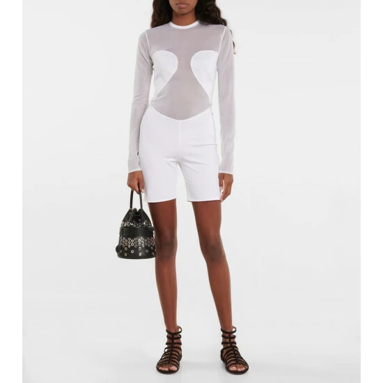 Sculptural curves define this paneled playsuit from Alaïa. Designed for a body-hugging fit, it’s made from heavyweight crêpe jersey and soft knitted mesh with a semi-sheer finish.