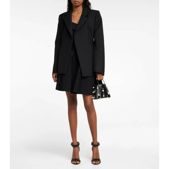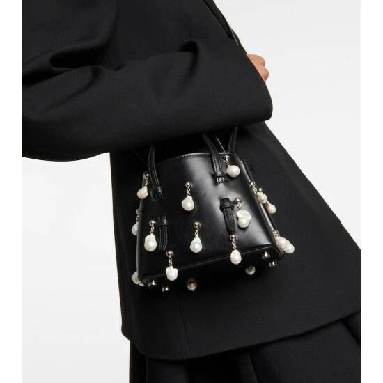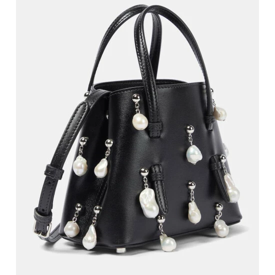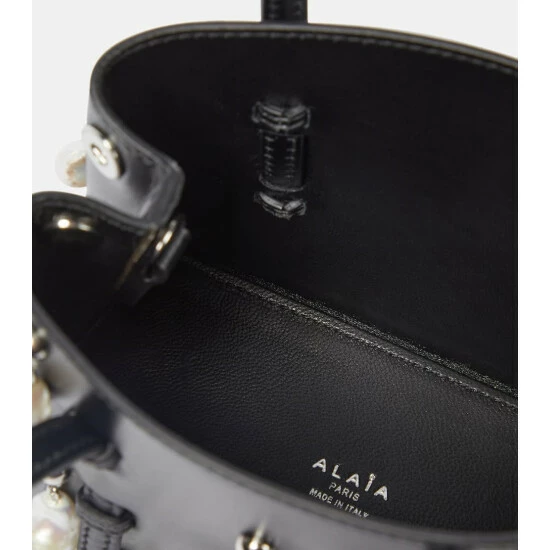 The Mina 16 bag showcases Alaïa’s penchant for architectural design. This leather style has faux pearls that embellish the exterior with dynamic depth, top handles that thread through the body, and a removable shoulder strap.