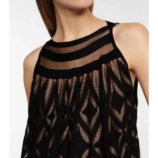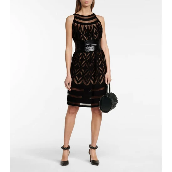 A momentous occasion calls for an Alaïa creation, like this striking black minidress with a geometric pattern – an unmistakable hallmark of the maison. Made in Italy from knit natté with lining for opacity, it has a shift silhouette with sheer bands at the neckline and hem. Accessorize with one of the label’s corset belts to cinch the waist.