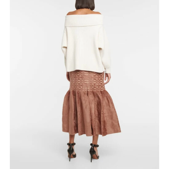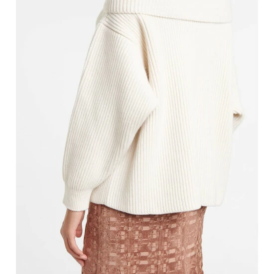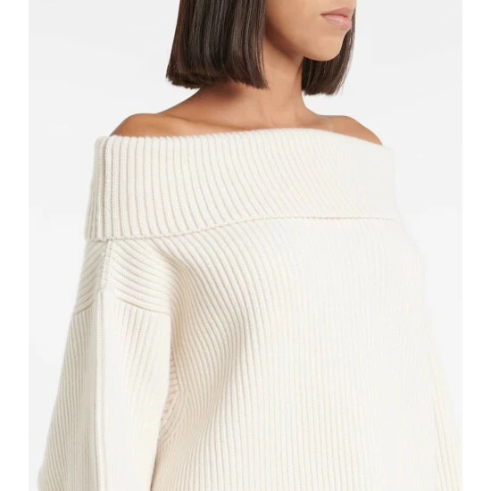 In timeless white, this off-shoulder sweater from Alaïa is primed for versatile styling. Ribbed-knit from a tactile blend of wool and cashmere, it has a fold-over neckline and supremely dropped shoulder seams.