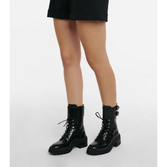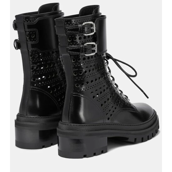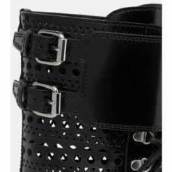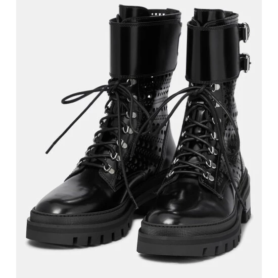 With their polished leather finish, Alaïa’s black ankle boots are detailed with the label’s “Vienne” motif. Featuring thick rubber soles and adjustable buckles at the ankle, these leather boots have a distinct military style, ideal to see the season through.